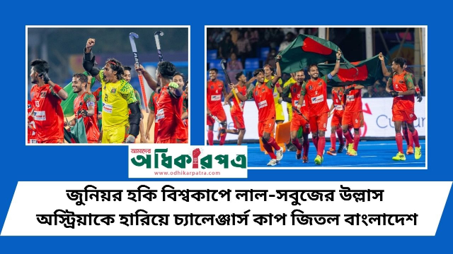 ভারতের তামিলনাড়ুর মাদুরাইয়ে সোমবার অনুষ্ঠিত ১৭তম স্থান নির্ধারণী ম্যাচে রোমাঞ্চকর লড়াইয়ে ৫–৪ ব্যবধানে অস্ট্রিয়াকে হারায় সিগফ্রিড আইকম্যানের শিষ্যরা। এটি ছিল তাদের টানা তৃতীয় জয়। দুর্দান্ত নৈপুণ্যেই জুনিয়র হকি বিশ্বকাপে চ্যালেঞ্জার্স কাপ জিতল বাংলাদেশ দল। গ্রুপ পর্ব থেকে ছিটকে পড়া আট দলের অংশগ্রহণে অনুষ্ঠিত এই পর্বকে এ বছর প্রথমবারের মতো “চ্যালেঞ্জার্স ট্রফি”নাম দিয়েছে এফআইএইচ। আর এ টুর্নামেন্টের প্রথম আসরের শিরোপাই নিজেদের করে নিলো বাংলাদেশ। দলে অসাধারণ ছন্দে থাকা তরুণ ফরোয়ার্ড আমিরুল ইসলাম আবারও করলেন হ্যাটট্রিক। ছয় ম্যাচে এটি তার পঞ্চম হ্যাটট্রিক যা এবারের আসরে তাকে নিয়ে গেছে এক অনন্য উচ্চতায়। ম্যাচের শুরু থেকেই লাল-সবুজের দাপুটে খেলাটা খেলে। ম্যাচের প্রথম দুই কোয়ার্টারেই বাংলাদেশ একটি করে গোল করে সুবিধাজনক অবস্থানে যায়। ১৫ মিনিটে পেনাল্টি কর্নার থেকে দলকে এগিয়ে দেন আমিরুল। ২৭ মিনিটে একইভাবে ব্যবধান বাড়ান হুজাইফা হোসেন। ৩৫ মিনিটে অস্ট্রিয়ার রক্ষণভাগের ভুল কাজে লাগিয়ে ফিল্ড গোলে রাকিবুল হাসান স্কোরলাইন করেন ৩–০। তৃতীয় কোয়ার্টারে অস্ট্রিয়া এক গোল শোধ করলেও বাংলাদেশ ছিল নিয়ন্ত্রণে। শেষ কোয়ার্টারে ছিল রোমাঞ্চের ঝড়। চতুর্থ কোয়ার্টার রীতিমতো নাটকীয়তায় ভরপুর। ৫০ মিনিটে আমিরুল পেনাল্টি স্ট্রোক থেকে করেন তার দ্বিতীয় গোল। ৫২ মিনিটে আরেকটি স্ট্রোক থেকে হ্যাটট্রিক পূর্ণ করেন তিনি। মাঝে অস্ট্রিয়ার বেঞ্জামিন কেলনার করেন একটি ফিল্ড গোল। শেষদিকে ৫–২ ব্যবধানে পিছিয়ে থাকা অস্ট্রিয়া ম্যাচে উত্তাপ বাড়ায়। ৫৭ মিনিটে জুলিয়ান কাইজার ও ৫৯ মিনিটে মাতেউস নিচকোভিয়াক দুটি গোল করে ম্যাচে ফেরার চেষ্টা করলেও শেষ পর্যন্ত বাংলাদেশ দৃঢ়তায় লিড ধরে রাখে এবং জয় নিশ্চিত করে।