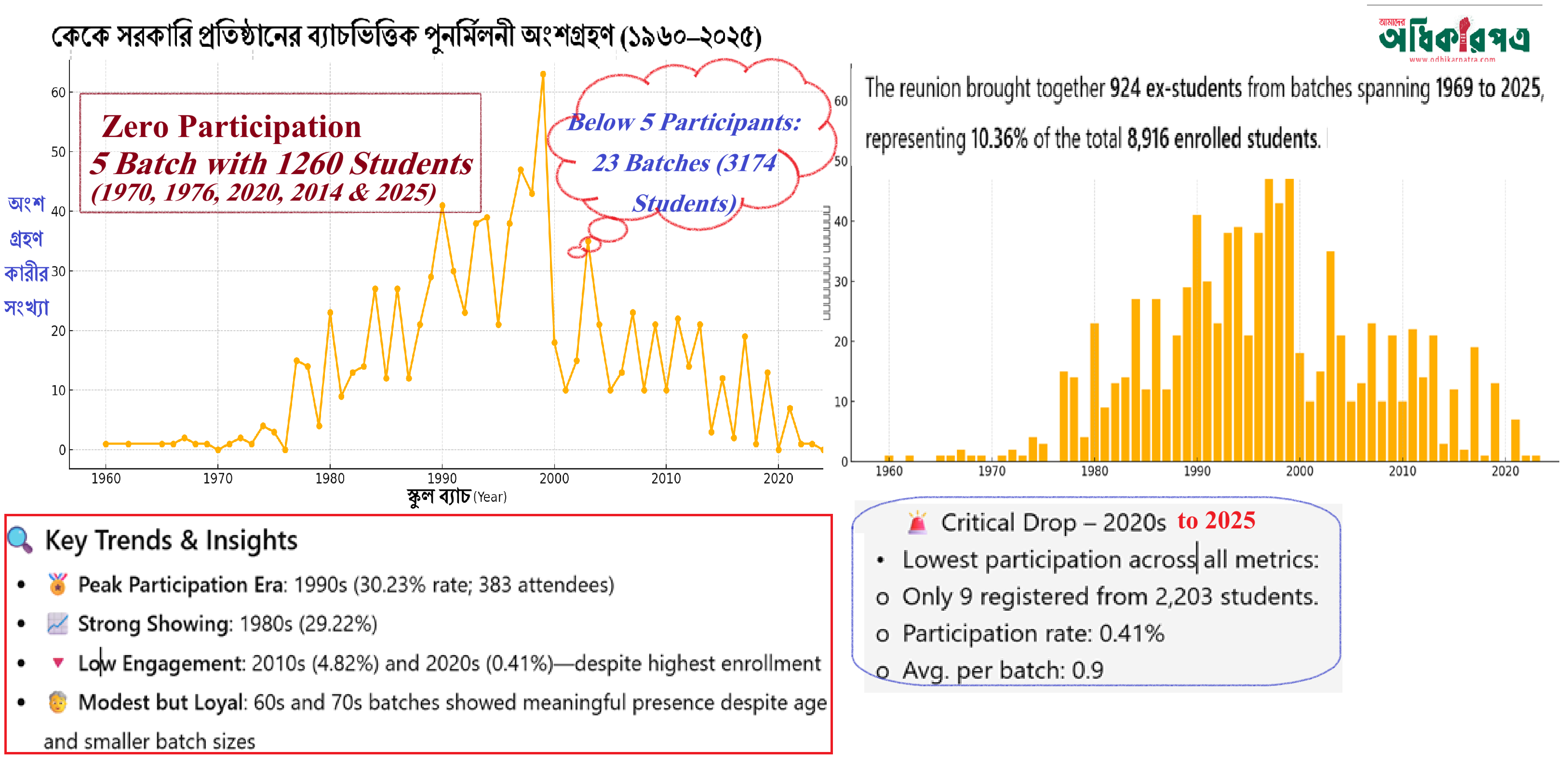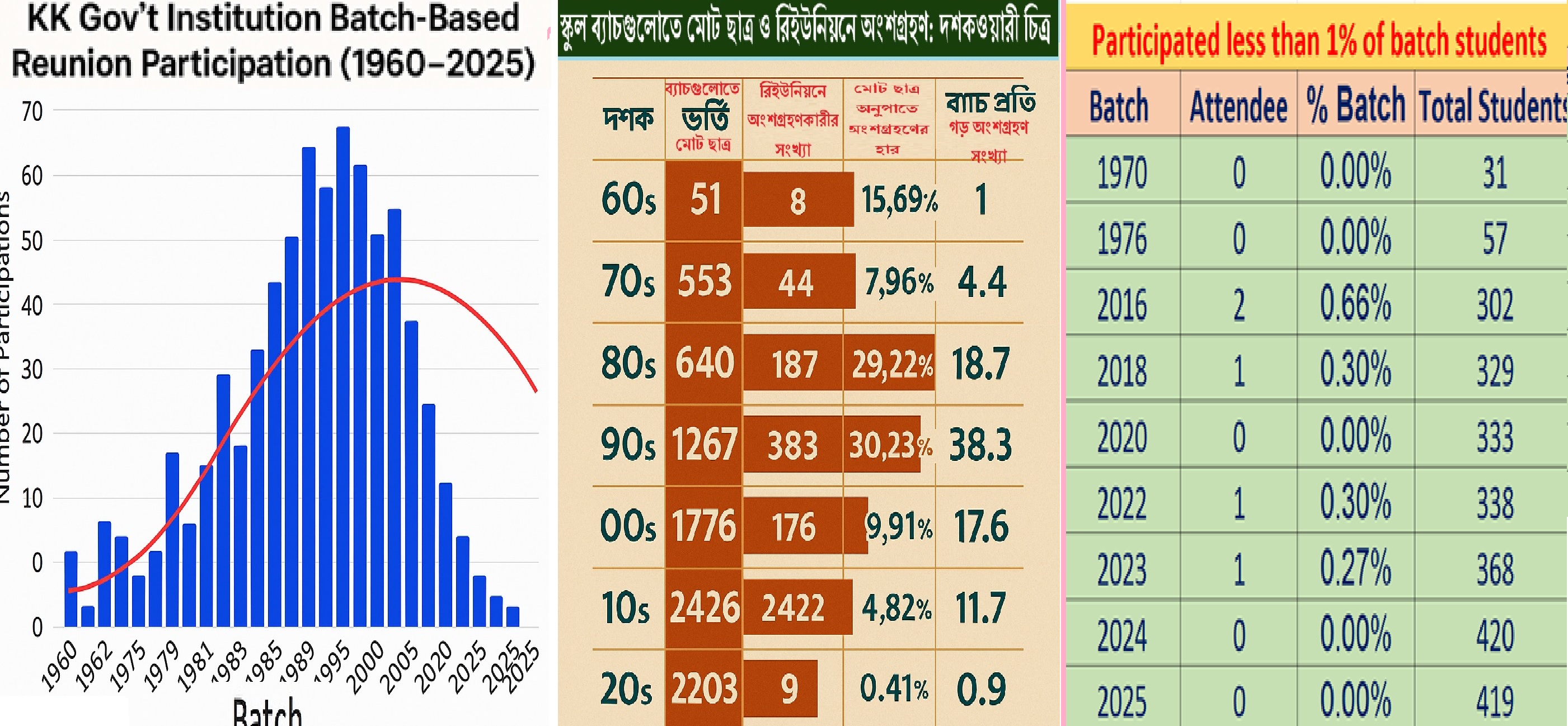 কে কে সরকারি ইনস্টিটিউশনের ২০২৫ সালের ঐতিহাসিক পুনর্মিলনী ছিল সাত দশকের স্মৃতি, প্রজন্ম, পরিসংখ্যান, অংশগ্রহণ সংকট, নস্টালজিয়া, নেতৃত্ব, ন্যায্য ফি-নীতি এবং অ্যালামনাই নেটওয়ার্ক নির্মাণের এক গভীর দলিল। এই ফিচার নিবন্ধে থাকিল পূর্ণাঙ্গ বিশ্লেষণ: অংশগ্রহণের হার, ব্যাচভিত্তিক পরিসংখ্যান, U-shaped curve, Diamond ও Gold Diamond প্রজন্ম, শূন্য-অংশগ্রহণ ব্যাচ, তরুণদের অনুপস্থিতির কারণ, ভবিষ্যতের সুপারিশ ও অ্যালামনাই উন্নয়নের পথরেখা।
