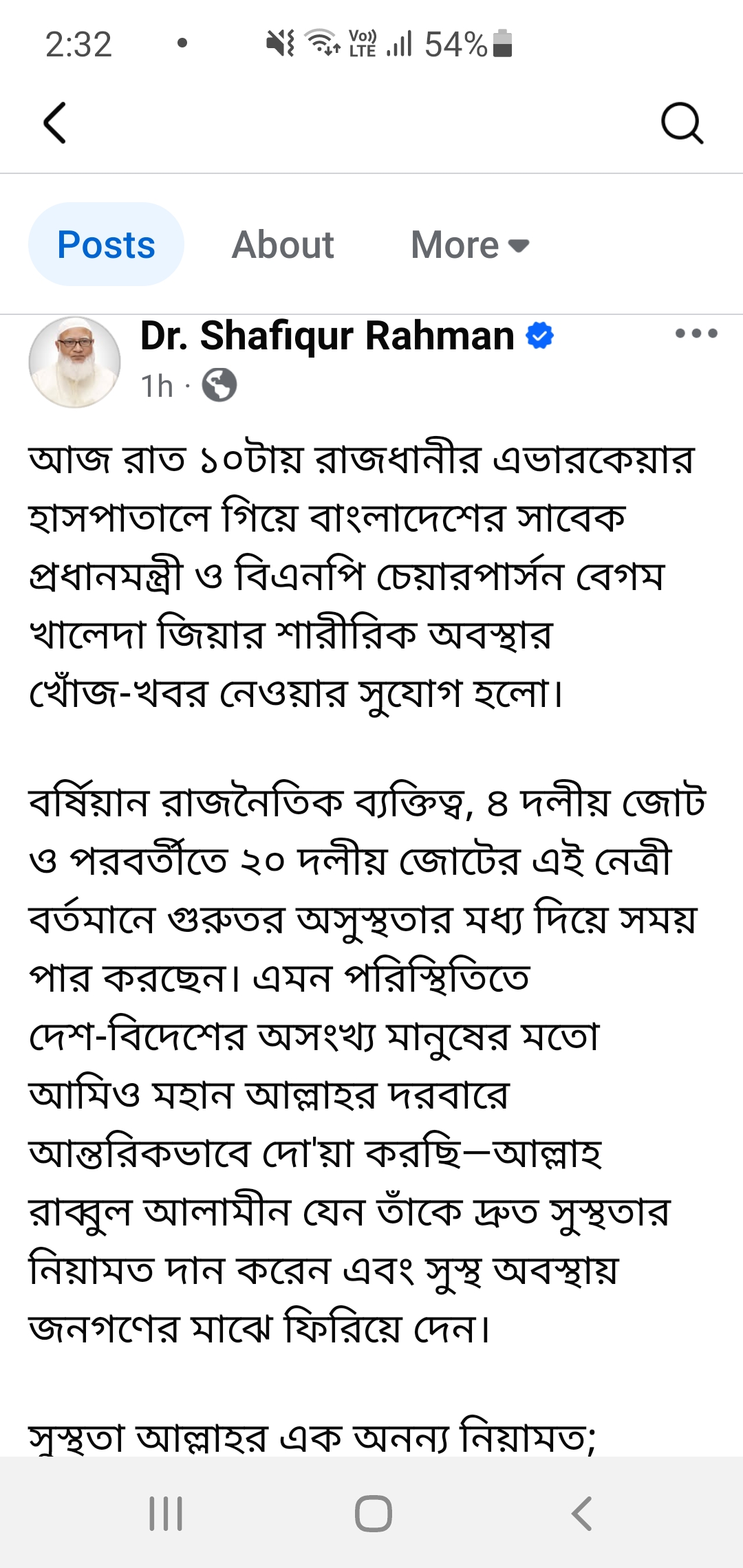 ফেসবুক পোস্টে ওই নেতা জানান, গভীর রাতে তিনি এভারকেয়ার হাসপাতালে গিয়ে বর্ষীয়ান রাজনৈতিক ব্যক্তিত্ব বেগম খালেদা জিয়ার শারীরিক অবস্থার খোঁজ নেওয়ার সুযোগ পান। পোস্টে তিনি সাবেক প্রধানমন্ত্রীকে 'বর্ষিয়ান রাজনৈতিক ব্যক্তিত্ব', '৪ দলীয় জোট ও পরবর্তীতে ২০ দলীয় জোটের নেত্রী' হিসেবে উল্লেখ করেছেন।
