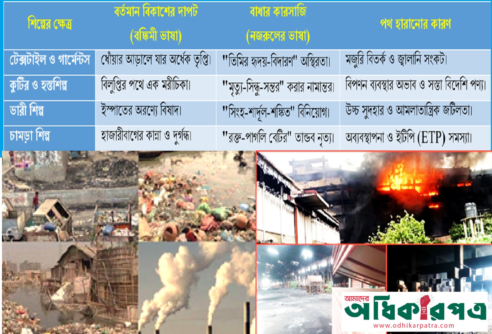 কাজী নজরুল ইসলাম তাঁহার 'দুর্দিনের যাত্রী' প্রবন্ধে তরুণদের রক্ত-যজ্ঞের পূজারি হইতে বলিয়াছিলেন। আজ শিল্পায়নের বাজারে সেই রক্ত-যজ্ঞ চলিতেছে পরিবেশ ধ্বংসের নামে। নজরুলের প্রবন্ধে এক 'কাপালিক' ছিল, যাহার কপালে ছিল রক্ত-তিলক। আমাদের বর্তমান শিল্পায়নের আজকের কাপালিক হইল— 'পরিকল্পনাহীন শিল্পায়ন ও নদীখেকো কলকারখানা'।