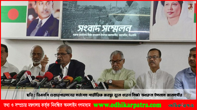 বিএনপি মহাসচিব বলেন ‘আমরা সরকারের কাছে সারাক্ষণই বলছি, চিকিৎসার জন্য তাকে দ্রুত বিদেশে পাঠাতে হবে। ডাক্তাররাও একই কথা বলছেন।’ ‘খালেদা জিয়ার চিকিৎসার ব্যবস্থা করা না হলে যেকোনও পরিস্থিতির সমস্ত দায় সরকারকেই নিতে হবে’ বলে হুঁশিয়ারি উচ্চারণ করেন মির্জা ফখরুল।