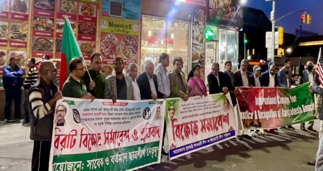 স্বৈরাচার, অবৈধ, অনির্বাচিত, অসাংবিধানিক ইউনূস সরকার দ্বারা অবৈধ ভাবে উপমহাদেশের প্রাচীন এবং মহান মুক্তিযুদ্ধের নেতৃত্বদানকারী, গণমানুষের দল বাংলাদেশ আওয়ামী লীগের সকল কার্যক্রম নিষিদ্ধ করার সিদ্ধান্তের তীব্র প্রতিবাদ ও নিন্দা জানিয়ে যুক্তরাষ্ট্র আওয়ামীলীগ,আওয়ামী পরিবার,সরল সহযোগীর অংগসংগঠন সমুহসহ বিভিন্ন সামাজিক, সাংস্কৃতিক,মানবাধিকার সংগঠন এবং ডায়াসপোরার অন্যান্য সংগঠনের উদ্দোগে নিউইয়র্কের জ্যাকসন হাইটস্থ ডাইভার্সিটি প্লাজায় গত রবিবার,১১ ই মে ২০২৫,রবিবার,সন্ধ্যায় এক প্রতিবাদ ও বিক্ষোভ সমাবেশে অনুষ্ঠিত হয়েছে ।খবর বাপসনিউজ ।