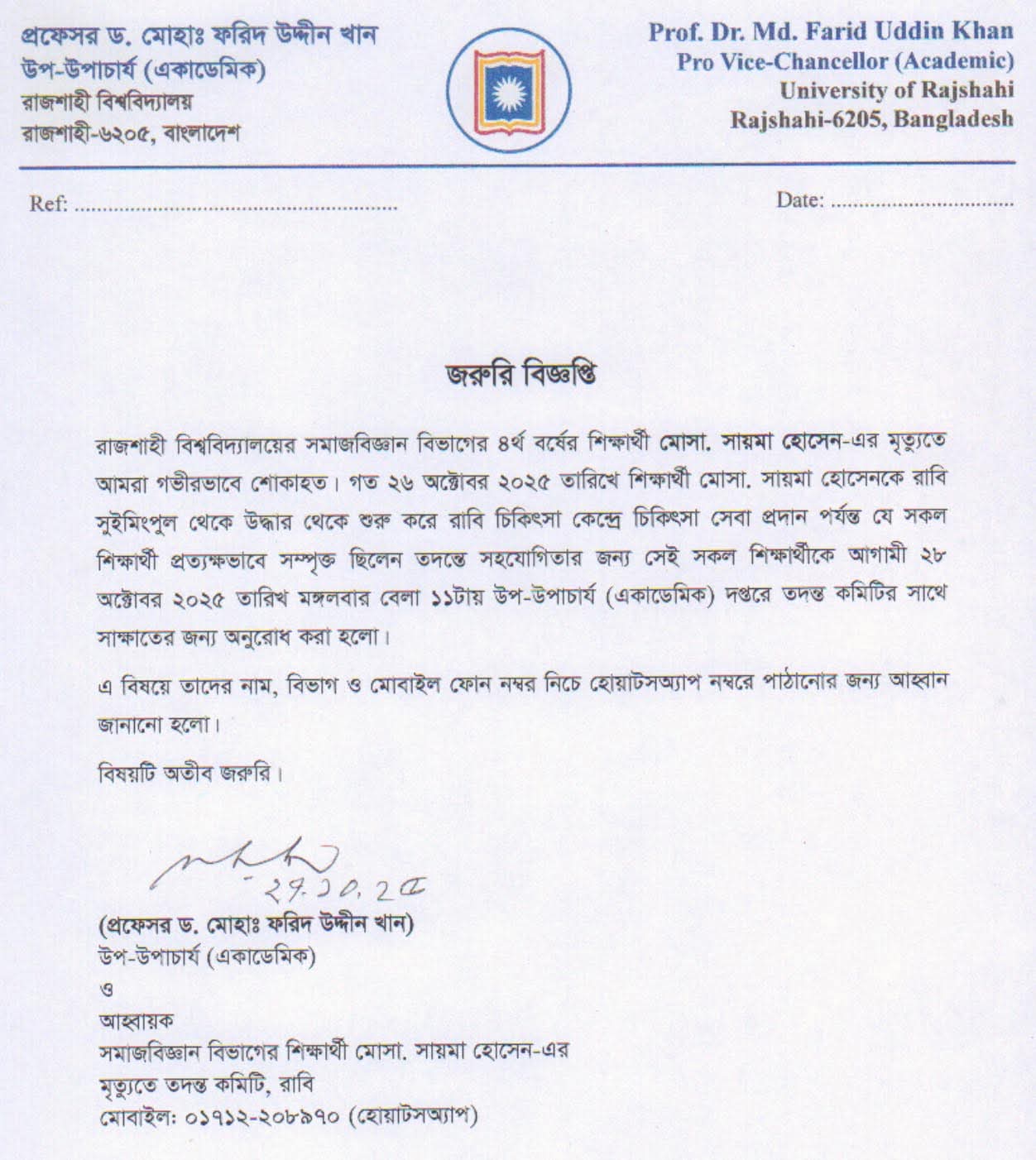 আজ, ২৯ অক্টোবর, ২০২৫ তারিখে রাজশাহী বিশ্ববিদ্যালয়ের উপ-উপাচার্য (একাডেমিক) অধ্যাপক ড. মো. ফরিদ উদ্দীন খান স্বাক্ষরিত এক জরুরি বিজ্ঞপ্তিতে এই তদন্তের বিষয়টি নিশ্চিত করা হয়েছে। বিজ্ঞপ্তিতে বিশেষভাবে সেই সকল শিক্ষার্থীদের প্রতি জরুরি ভিত্তিতে সহযোগিতা কামনা করা হয়েছে, যারা ২৮ অক্টোবর মঙ্গলবার বেলা ১১টায় শিক্ষার্থী মোসা. সায়মা হোসেনকে শহীদ মিনার চত্বর থেকে উদ্ধার করে রাবি চিকিৎসা কেন্দ্রে চিকিৎসা সেবা প্রদানে প্রত্যক্ষ বা পরোক্ষভাবে সম্পৃক্ত ছিলেন।