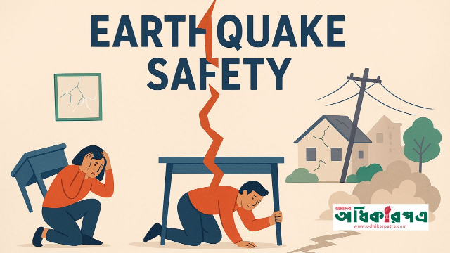 - ঘরে থাকলে ড্রপ–কাভার–হোল্ড অন পদ্ধতি অনুসরণ করুন। মেঝেতে বসে পড়ুন, শক্ত টেবিল/ডেস্কের নিচে আশ্রয় নিন এবং টেবিল শক্তভাবে ধরে থাকুন।