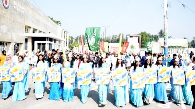 দিবসটি উপলক্ষে সকাল ১০টায় বিশ্ববিদ্যালয়ের প্রধান ফটক ‘শহিদ মীর মুগ্ধ তোরণ’ থেকে একটি বর্ণাঢ্য শোভাযাত্রা বের হয়। শোভাযাত্রাটি দ্বিতীয় গেট ঘুরে অদম্য বাংলা চত্বরে গিয়ে শেষ হয়। শিক্ষক-শিক্ষার্থী, কর্মকর্তা-কর্মচারীসহ বিভিন্ন শ্রেণি-পেশার মানুষ এতে অংশ নেন।