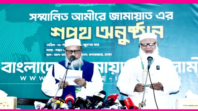 ঢাকা, ২৮ নভেম্বর ২০২৫ : বাংলাদেশ জামায়াতে ইসলামী ২০২৬–২০২৮ মেয়াদের জন্য পুনর্নির্বাচিত আমীর ডা. শফিকুর রহমান আজ আনুষ্ঠানিকভাবে শপথ গ্রহণ করেছেন। রাজধানীতে অনুষ্ঠিত এই শপথ অনুষ্ঠানে ইসলামী ও জাতীয় বিভিন্ন রাজনৈতিক দলের শীর্ষ নেতারা অতিথি হিসেবে উপস্থিত ছিলেন, যা আনে বিশেষ গুরুত্ব।