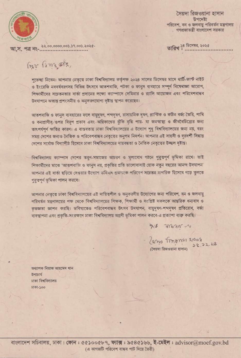 সম্মাননাপত্রে উল্লেখ করা হয়, উপাচার্য অধ্যাপক ড. নিয়াজ আহমদ খানের নেতৃত্বে ঢাকা বিশ্ববিদ্যালয় পরিবেশ সংরক্ষণে অনন্য ও দৃষ্টান্তমূলক ভূমিকা রেখে চলেছে। আতশবাজি ও ফানুস ব্যবহারের ফলে বায়ুদূষণ, শব্দদূষণ, রাসায়নিক দূষণ এবং অগ্নিকাণ্ডের ঝুঁকি বৃদ্ধি পায়; একই সঙ্গে পাখি ও বন্যপ্রাণীর ওপর বিরূপ প্রভাব পড়ে এবং প্লাস্টিক ও কঠিন বর্জ্যের মাধ্যমে জনস্বাস্থ্য ও জীববৈচিত্র্য ক্ষতিগ্রস্ত হয়—এই বাস্তবতায় ঢাবির উদ্যোগ কেবল বিশ্ববিদ্যালয় ক্যাম্পাসেই সীমাবদ্ধ নয়, বরং সমগ্র দেশের জন্য নৈতিক ও পরিবেশবান্ধব নেতৃত্বের অনুপম উদাহরণ।