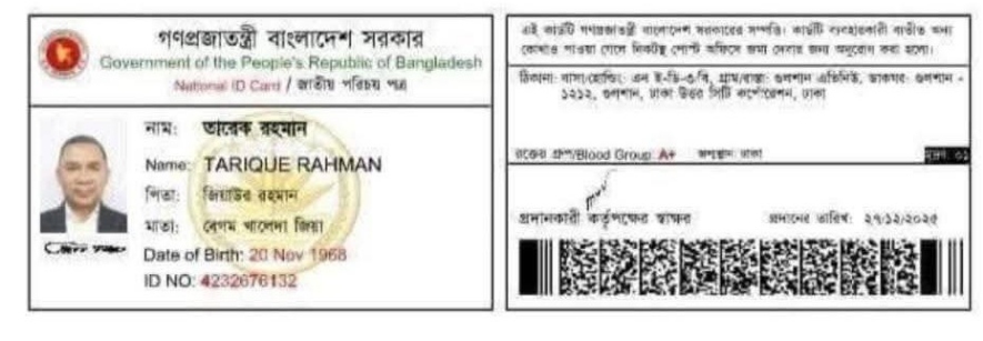 এর আগে শনিবার (২৭ ডিসেম্বর) রাজধানীর আগারগাঁওয়ে নির্বাচন কমিশনের কার্যালয়ে গিয়ে তারেক রহমান ভোটার হিসেবে নিবন্ধন ও জাতীয় পরিচয়পত্র (এনআইডি) পাওয়ার জন্য প্রয়োজনীয় সব কার্যক্রম সম্পন্ন করেন। সেখানে তিনি আঙুলের ছাপ, চোখের মণির (আইরিশ) প্রতিচ্ছবি এবং অন্যান্য বায়োমেট্রিক তথ্য প্রদান করেন।