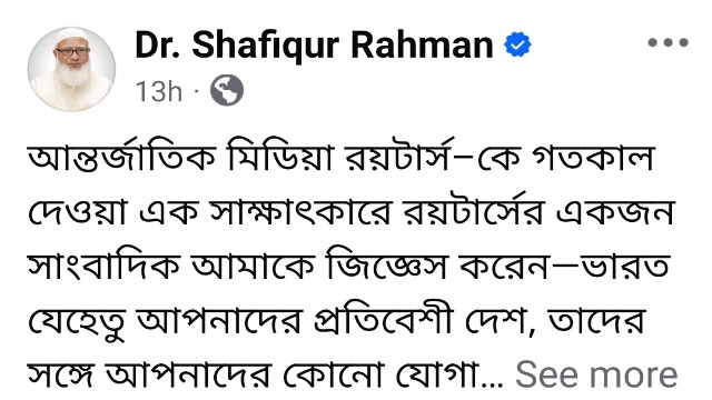 সম্প্রতি আন্তর্জাতিক সংবাদ সংস্থা রয়টার্স–কে দেওয়া সাক্ষাৎকারের সূত্র ধরে ডা. শফিকুল ইসলাম নিজেই ফেসবুক পোস্টে যে ব্যাখ্যা দিয়েছেন, তা মূলত একটি গুরুত্বপূর্ণ প্রশ্ন সামনে এনেছে—রাজনীতিতে কূটনৈতিক সৌজন্য আর গোপন রাজনীতির সীমারেখা কোথায়?