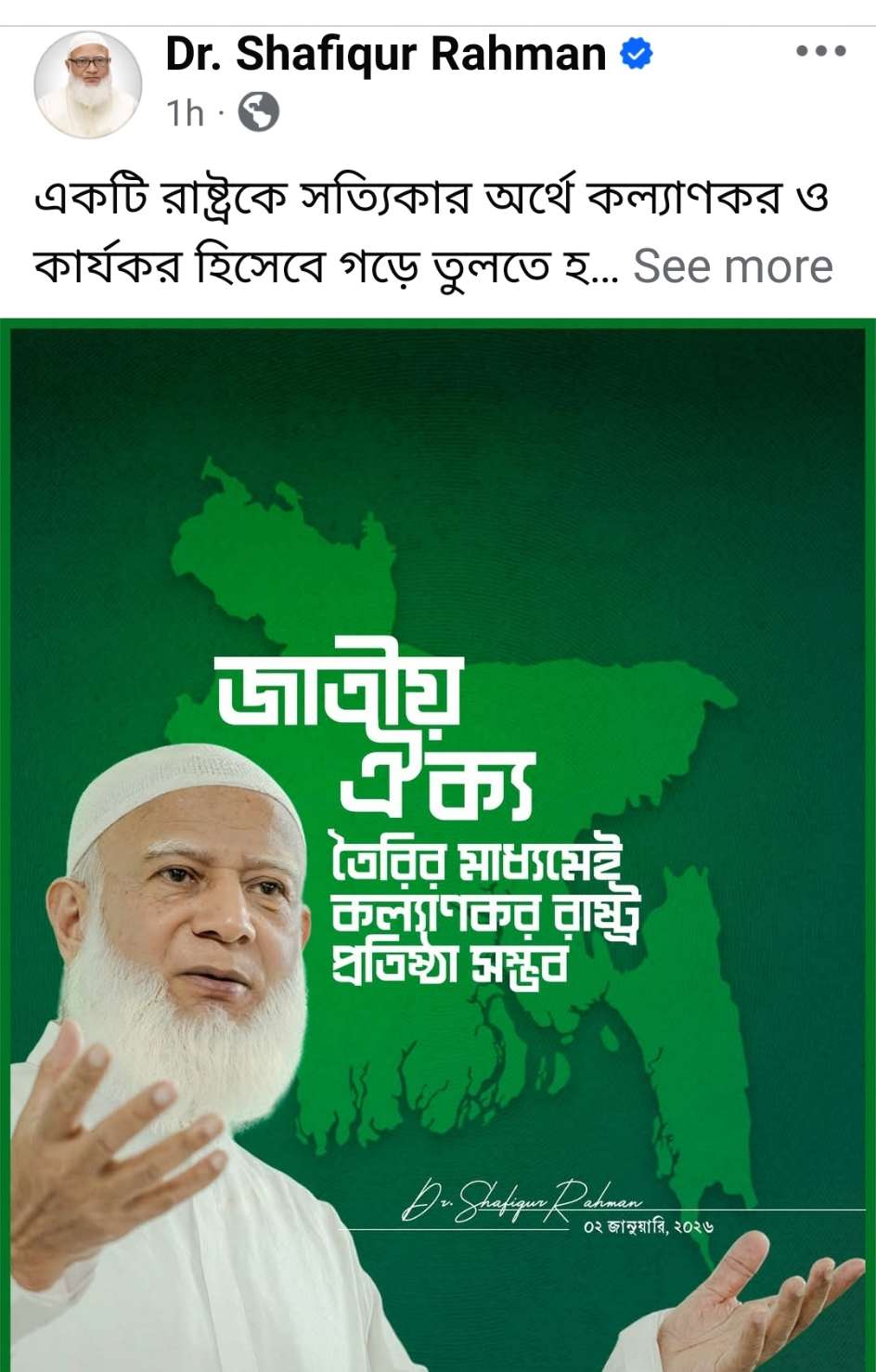 তিনি তার পোস্টে হিংসা ও বিভেদ পরিহার করে ন্যায় ও ইনসাফভিত্তিক রাষ্ট্র গঠনের আহ্বান জানিয়ে বলেন—