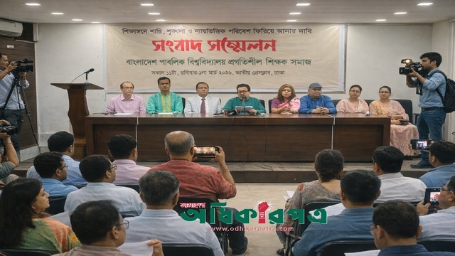 জাতীয় প্রেস ক্লাবে আয়োজিত সংবাদ সম্মেলনে বাংলাদেশ পাবলিক বিশ্ববিদ্যালয়সমূহের প্রগতিশীল শিক্ষক সমাজ অন্তর্বর্তীকালীন সরকারের ১৮ মাসের শাসনামলে শিক্ষাঙ্গনে অরাজকতা, শিক্ষক নিগ্রহ ও বাকস্বাধীনতা হরণের অভিযোগ তুলে ১৪ দফা দাবি পেশ করেছে। বহিষ্কারাদেশ প্রত্যাহার, মিথ্যা মামলা বাতিল, পেশাজীবীদের মুক্তি এবং শিক্ষার পরিবেশ পুনরুদ্ধারের আহ্বান জানানো হয় সম্মেলনে।