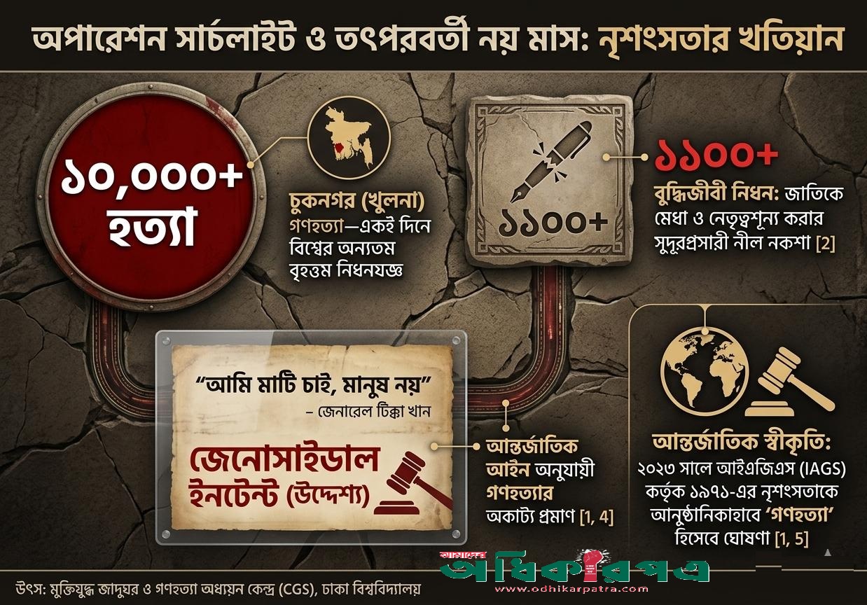 সেদিন আকাশ ভেঙে তপ্ত সীসা পড়েনি, পড়েছিল বর্বরতার এক পৈশাচিক উল্লাস। ১৯৭১ সালের ২৫শে মার্চের সেই কালরাত্রি কেবল বাঙালির ইতিহাসের কোনো কালো অধ্যায় নয়, বরং মানবসভ্যতার ইতিহাসে এক গভীরতম ক্ষত। অর্ধশতাব্দী পেরিয়ে গেলেও সেই ভয়াল গণহত্যার আন্তর্জাতিক স্বীকৃতি আজও মেলেনি বিশ্বসংস্থার দলিলে। প্রশ্ন জাগে, ইতিহাসের এই দায়ভার বহনকারী আমাদের শিক্ষাবিদ, গবেষক এবং বুদ্ধিজীবী সমাজ কি পারেন না বিশ্ববিবেকের রুদ্ধ দ্বারে নতুন করে কড়া নাড়তে?